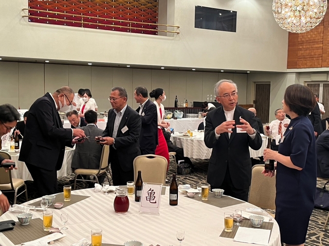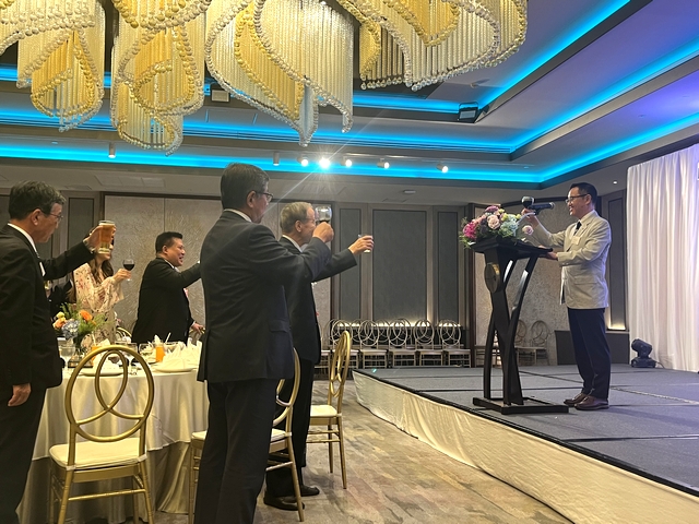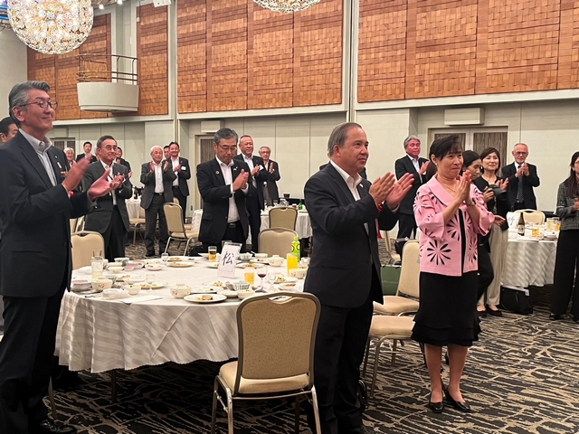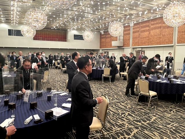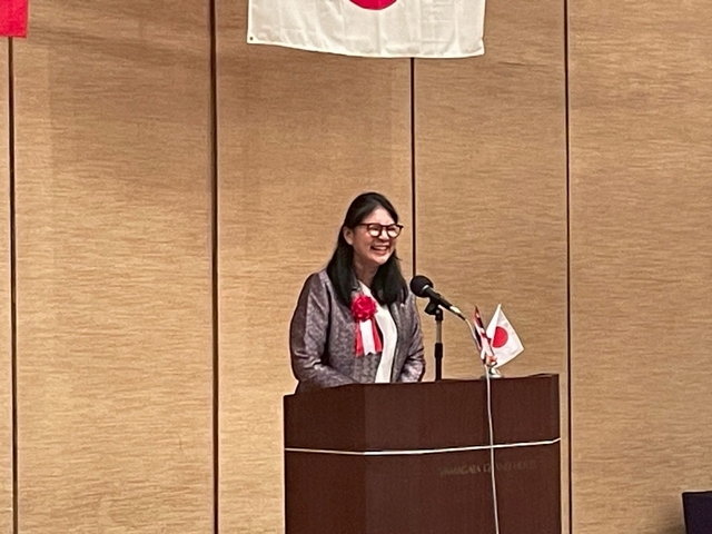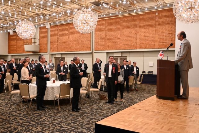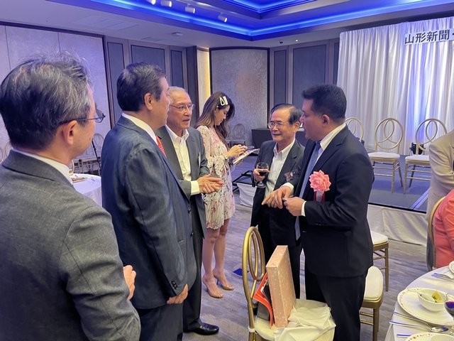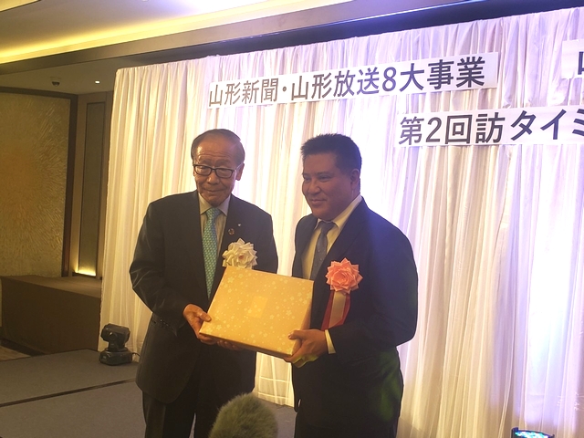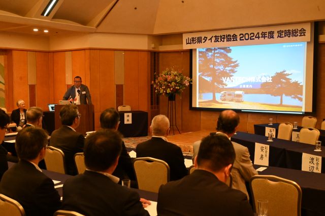 総会後の設立記念パーティーには、特別顧問にご就任いただいた吉村美栄子山形県知事ならびにバンサーン・ブンナーク大使からもご出席を賜り、志田英紀山形県議会議長のご発声による乾杯で祝宴が始まりました。宴の途中では、前日まで山形県内各地でロケを行ったタイのテレビ局チャンネル3によるドラマ撮影の様子が披露され、テレビ放映によるタイ国内での山形県の知名度向上や来県機会の増加に繋がるとの声が多く聞かれました。県内各地の地酒と食材を使った料理とともに歓談が進んだ宴もお開きの時間となり、山形県経済同友会の鈴木隆一代表幹事の中締めでパーティーも盛会に終了いたしました。