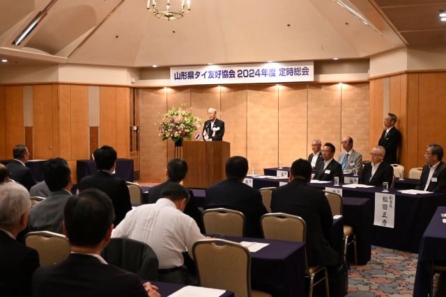 会員174名が出席した山形県タイ友好協会設立総会では、規約・役員・事業計画・予算についてご審議いただき、協会の初代会長には一般社団法人山形県経営者協会会長の寒河江浩二氏が就任いたしました。今後の事業においては、協会事業として訪タイミッションを実施するほか、タイスキー連盟やタイサッカーチームの合宿誘致活動の実施、また会員事業としては、会員の皆さまが実施するタイとの交流事業に関して、その意義や効果が認められると思われる取り組みに対しては協会として側面支援を行うこと等が決定いたしました。