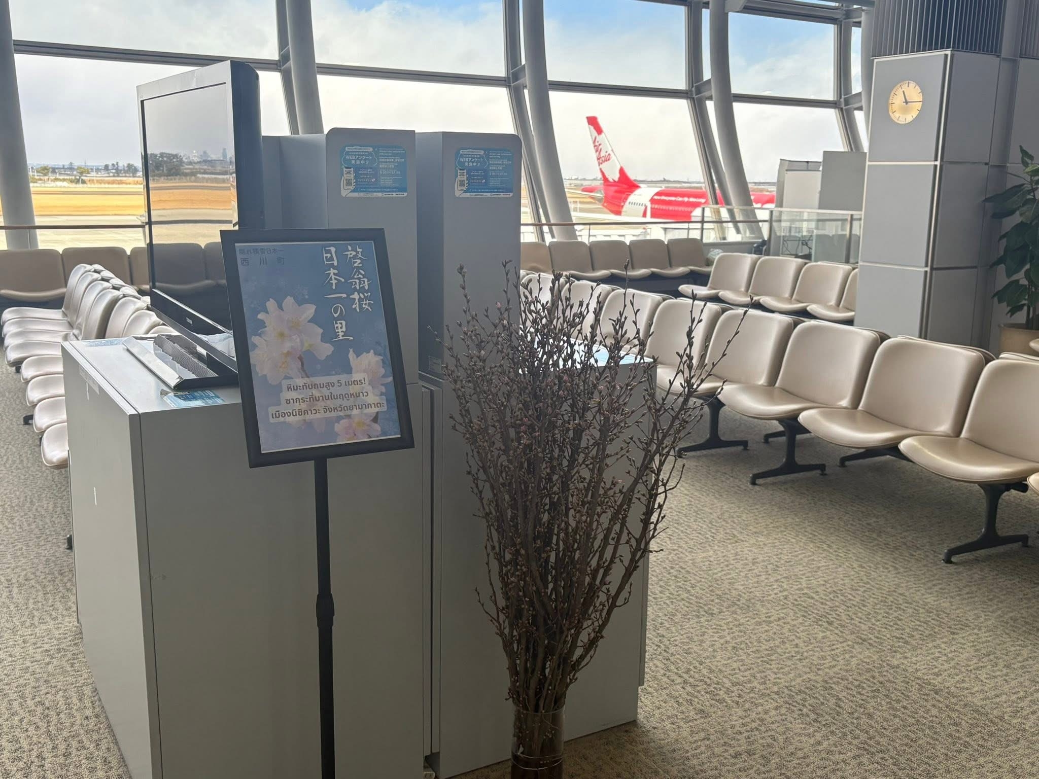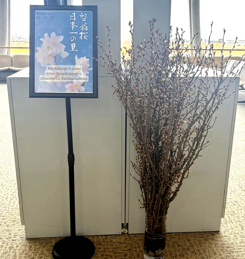2月19日、当協会会員の月山朝日観光協会さまのお取り組みの一環で、仙台空港さまご協力のもと、西川町産の啓翁桜が国際線出発搭乗待合エリアに展示されました。